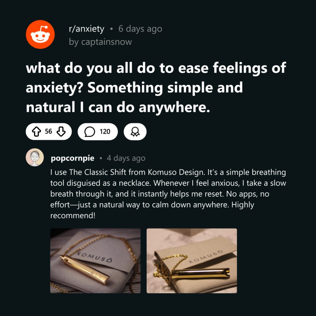 Reducing stress and anxiety can be a touchy subject, and it’s not always a one-size-fits-all solution. But before you dismiss the idea that a simple breathing tool can transform your life, I’d urge you to read the founding story of Komuso, and how the Shift necklace became a best-selling product with hundreds of thousands of very real, very authentic, 5 star reviews and countless life changing stories.